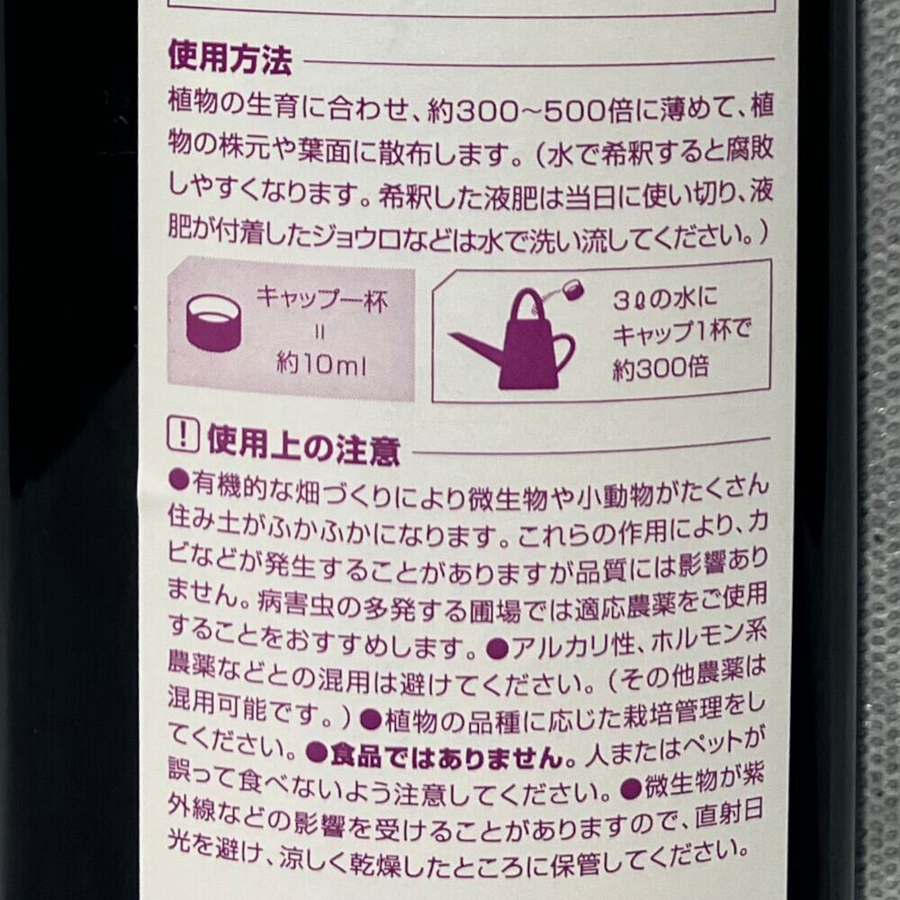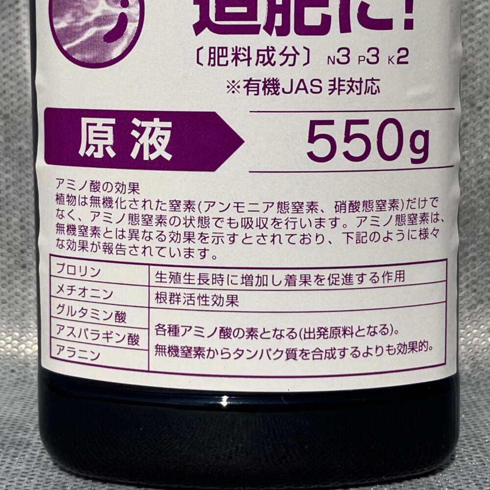 ※アミノ酸系の液肥は、他の酸性液肥に比べ緩衝力を持つと言われていますが、アルカリ性の液肥との混用は避けたほうが無難です。