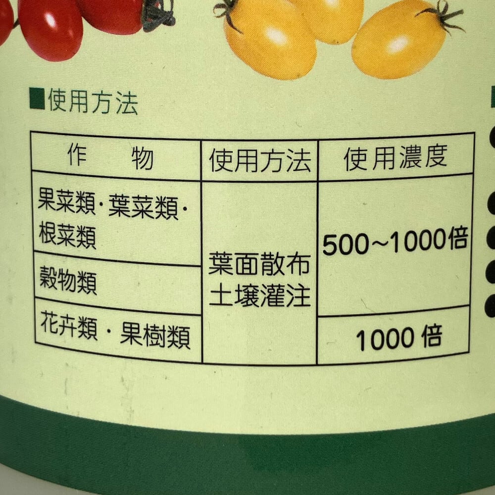 窒素中断、徒長防止を目的に使用される場合は500倍前後の希釈でご利用ください。