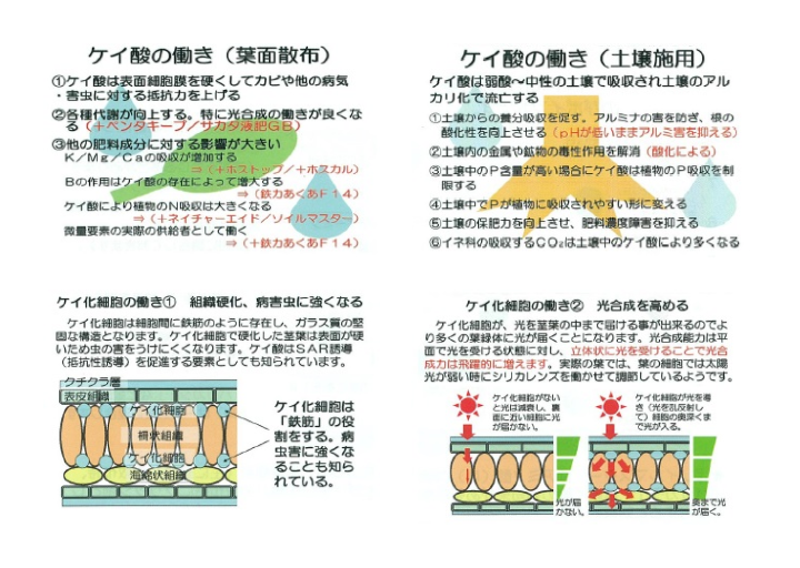水溶性ケイ酸を20%(pH3.0前後)含有する高機能ケイ酸補給資材です。水溶性のため吸収性に優れ、吸収されたケイ酸は細胞壁の内側に入り込み、ケイ化細胞(※)を形成して植物組織を硬く丈夫にします。これにより受光体勢が改善され、過蒸散を抑えるとともに、病害虫や倒伏の被害を軽減します。さらに、土壌散布によって根張りを促進し、配合された機能性糖類が吸収促進や耐凍性の向上にも寄与します。
