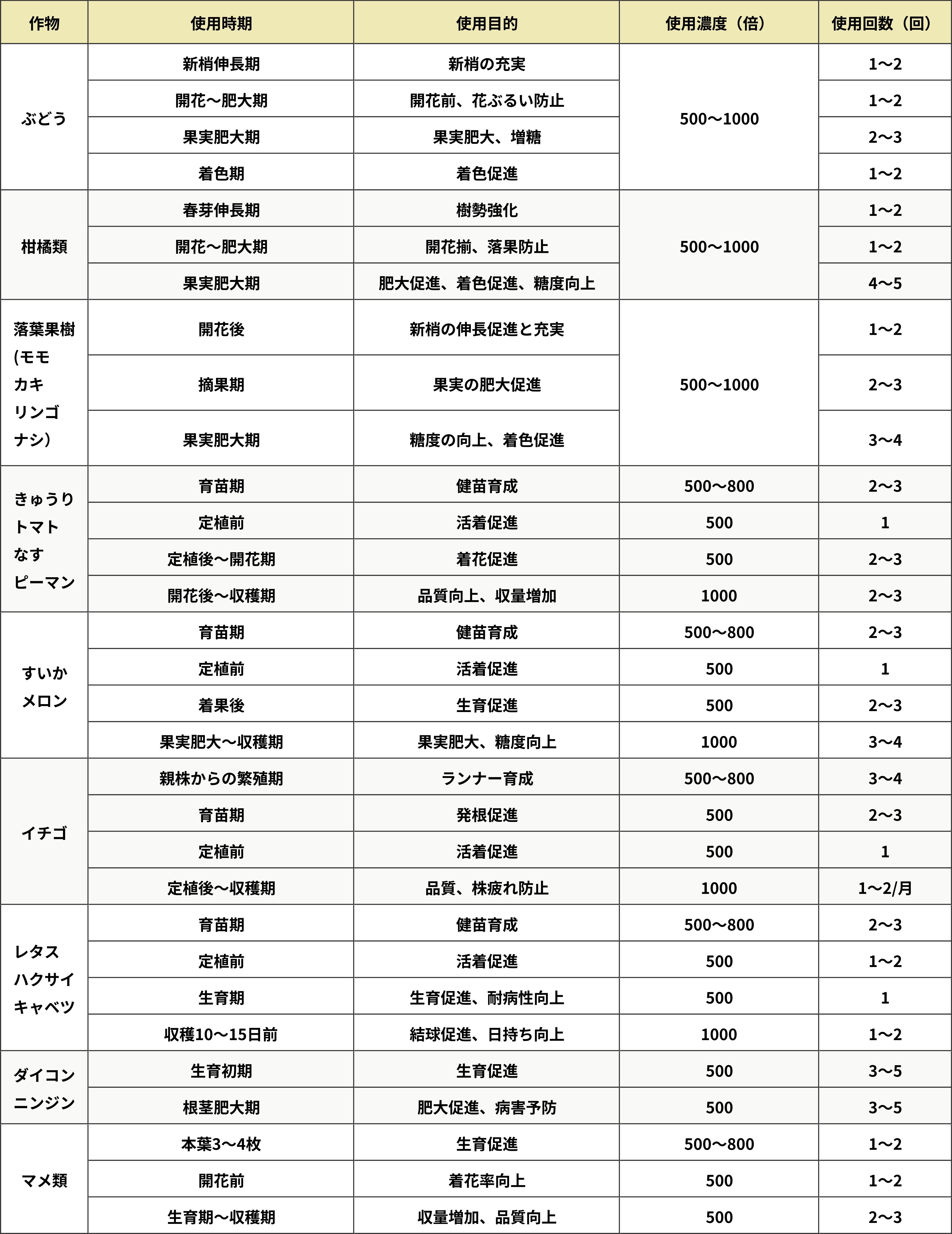 ※葉面散布の場合は、下記使用濃度の倍程度に希釈してください。